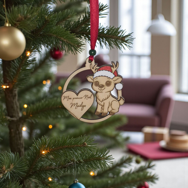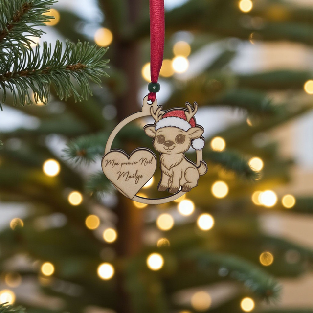 Boule de Noël en bois personnalisée - premier Noël, cadeau de naissance avec prénom, déco Renne